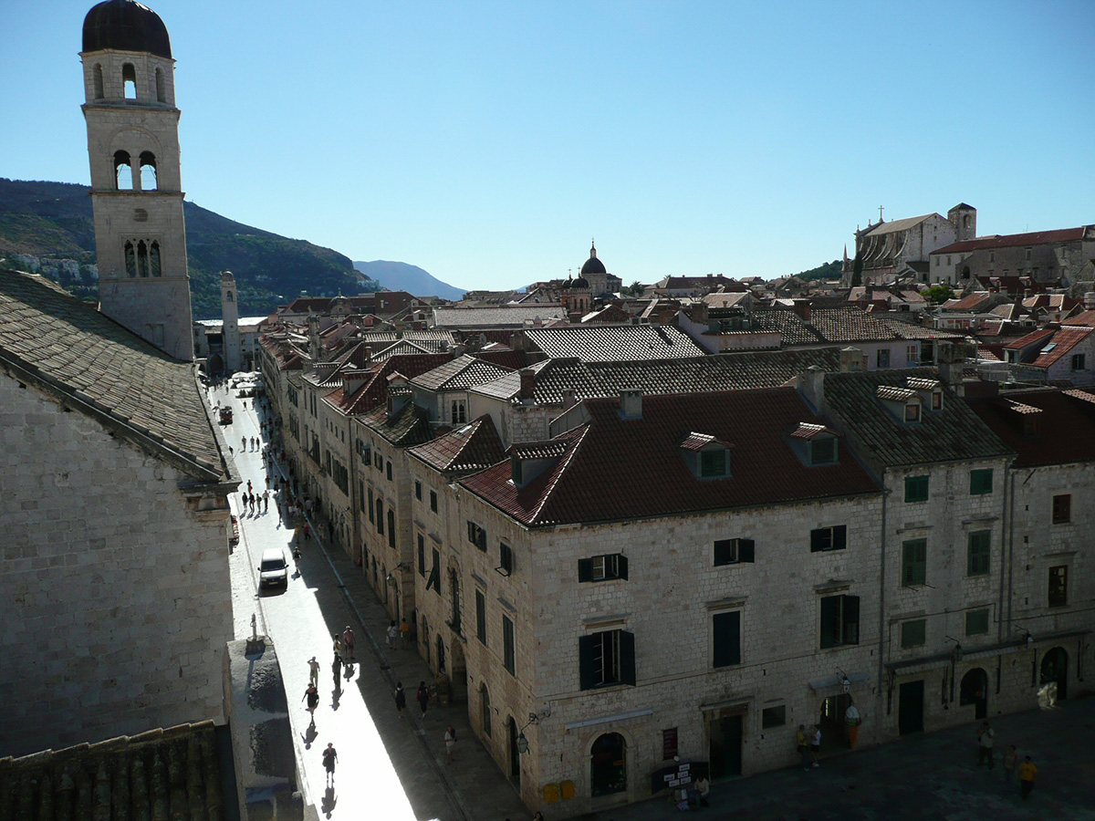 The limestone Stradun flanked by red roof buildings.
