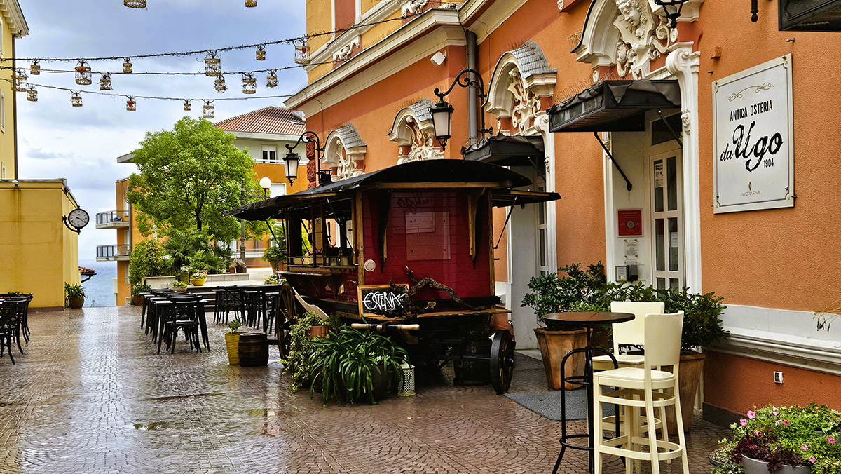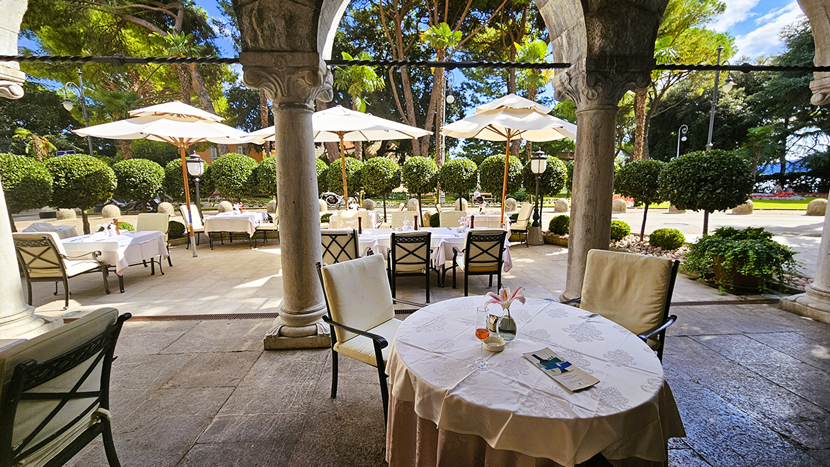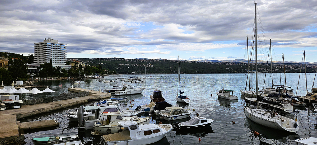 From the highway, one descends via serpentine bends to Opatija. At first glance, it’s apparent that this is the St. Tropez of Croatia – high fashion, luxurious, and expensive. The shoreline is lined by marinas where pleasure boats bob in the ocean, ‘beaches’ made of natural stones or concrete slabs, and hotels and restaurants that offer padded, outdoor, comfy chaises and umbrellas at a price! Steel stepladders descend into the clear, calm, warm waters.