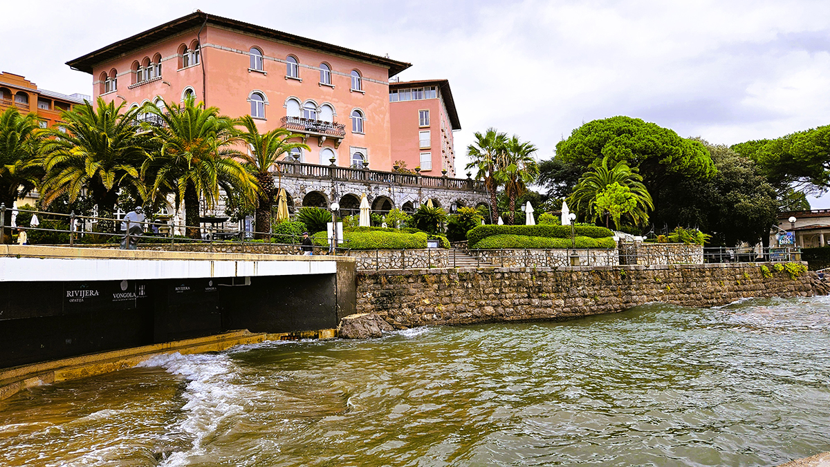 From the highway, one descends via serpentine bends to Opatija. At first glance, it’s apparent that this is the St. Tropez of Croatia – high fashion, luxurious, and expensive. The shoreline is lined by marinas where pleasure boats bob in the ocean, ‘beaches’ made of natural stones or concrete slabs, and hotels and restaurants that offer padded, outdoor, comfy chaises and umbrellas at a price! Steel stepladders descend into the clear, calm, warm waters.