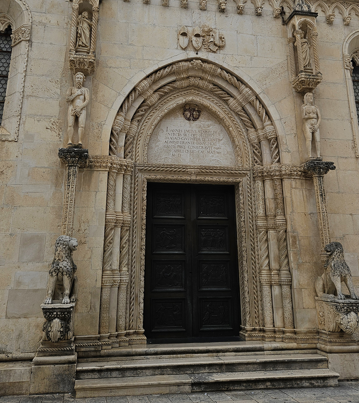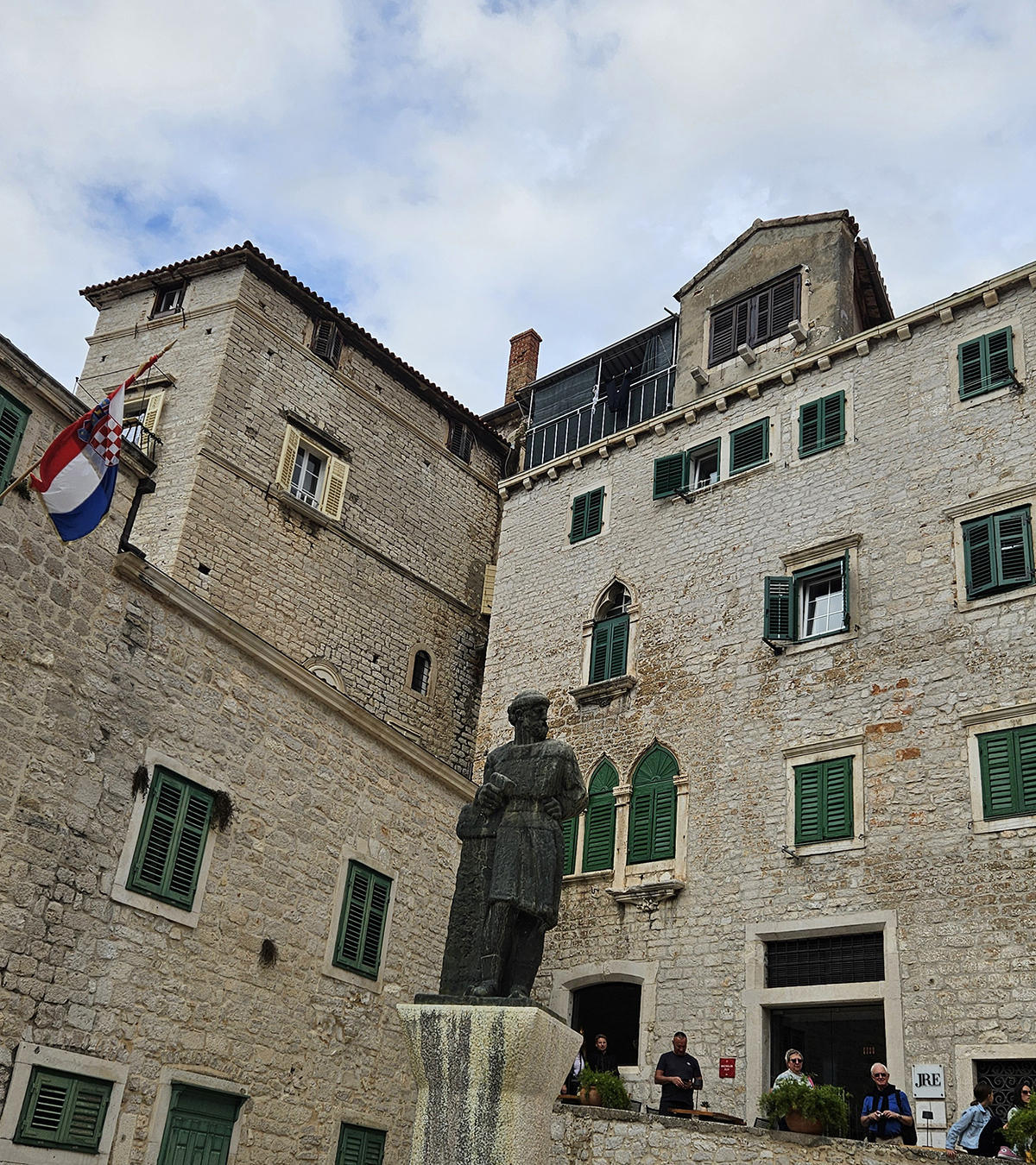 In the plaza next to St. James Cathedral, a statue by the renowned Croatian sculptor Meštrović pays tribute to the Venetian architect Giorgio de Sebenico, also known as Juraj Dalmatinac, for his work on the Cathedral of St. James.