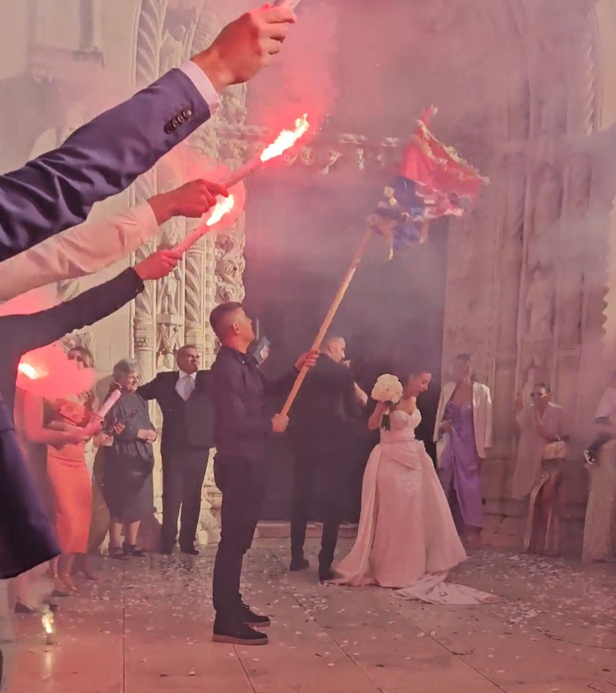 As the bride and groom exited the Cathedral, a band struck up. The guests formed a circle around the newlyweds, and the men sang and danced while hoisting flags and red torches, which symbolize driving away evil spirits. The circle formation of the dance represents unity and the continuation of life.