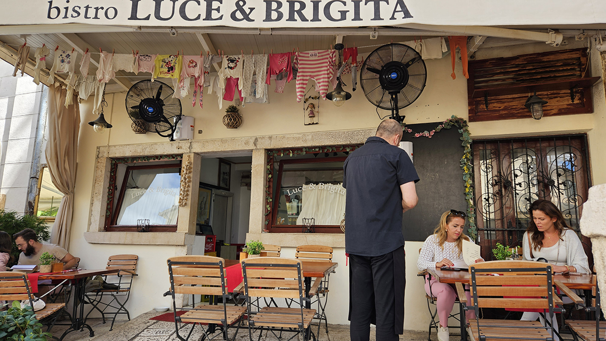 A walk along the waterfront of the town is a must. It’s lined with restaurants and bars, set against a backdrop of ancient stone-red-roofed buildings, and offers views of the surrounding islands and the crystal-clear blue sea.